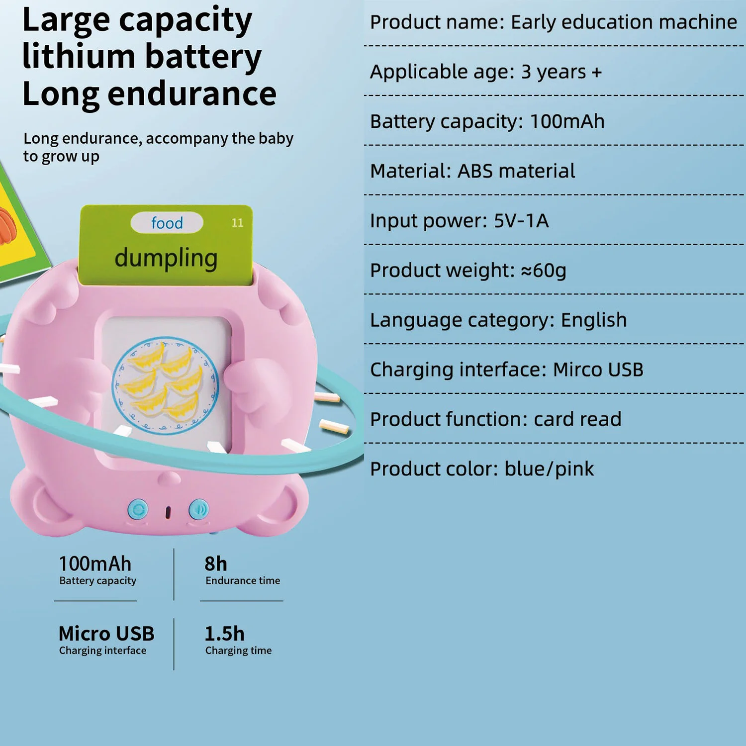 - Interactive Learning: Insert flashcards into the device to hear correct pronunciations, aiding in vocabulary building and language comprehension.